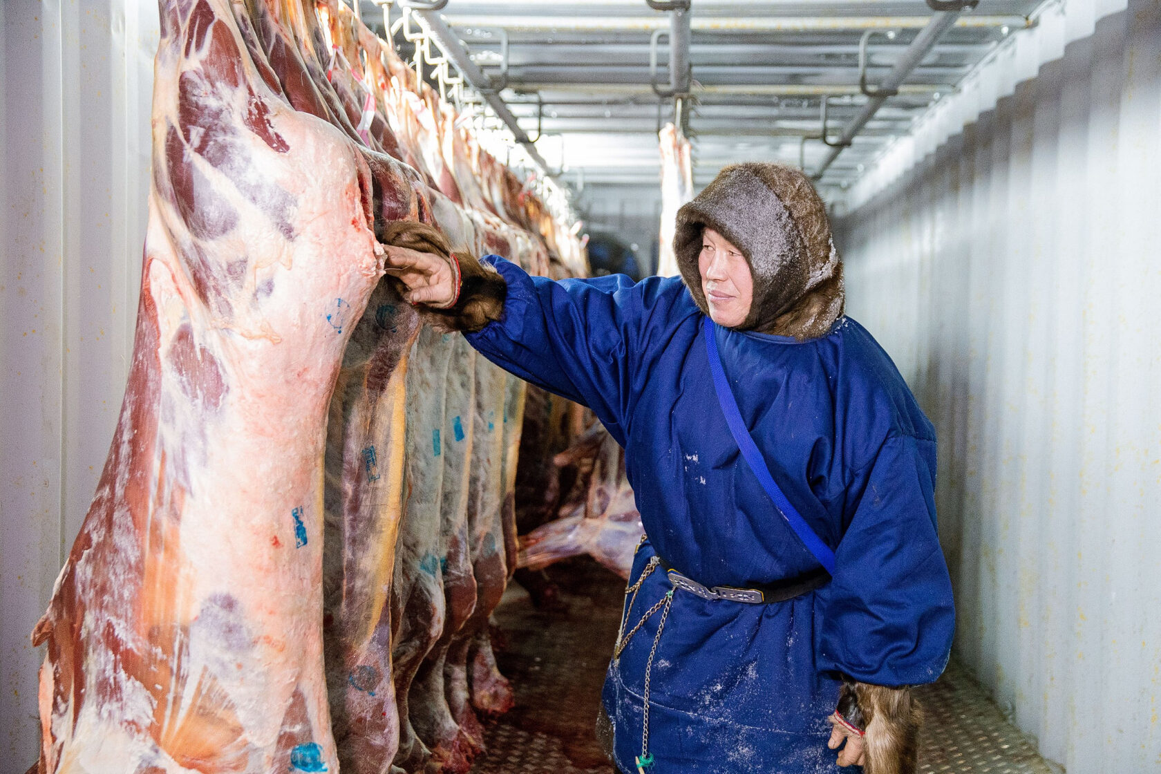 — Осталось пройти ещё трём бригадам. Сейчас здесь работают 13 человек и ещё двое дежурных. Обязанности у каждого свои: двое на убое, трое снимают шкуры, один потрошит и так далее. Начали молодых ребят привлекать, работа здесь тяжёлая, те, кто опытный, — уже не могут трудиться из-за возраста. Раньше-то на улице убой проводили, в мороз. Руки отогреешь — и снова за работу. Сейчас в тепле. Думаю, тысячу голов в этом году забьём.